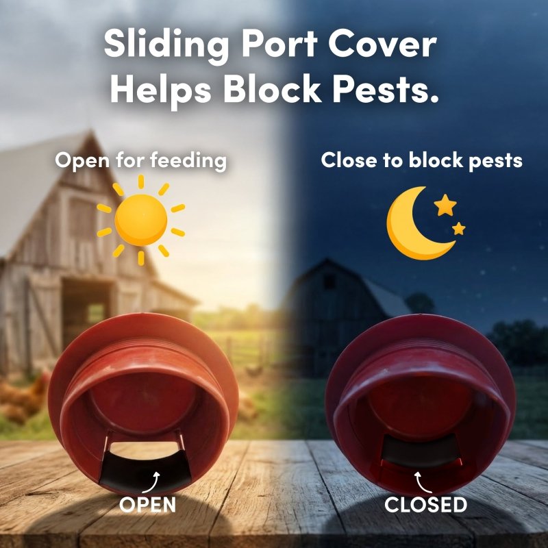 Sliding Port Covers Help Keep Pests Out | Our four large ports with sliding covers make it easier to keep out pests. During the day leave the port cover open allowing for easy access to the chicken feed, close them at night to close off access and keep unwanted guests out