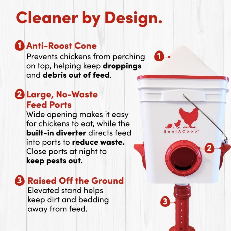 Reduce Wasted Feed | The large feed ports have a wide opening, making it easier for chickens to access and eat the feed. Covered feeder port helps keep feed protected, and the hooded design helps reduce scattering, keeping more feed in the feeder and less on the ground!