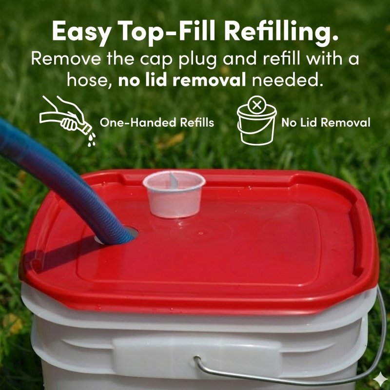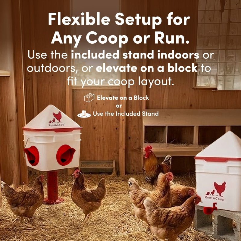 High Capacity Means Fewer Refills | The 10lb feeder and 2-gallon waterer are both designed to reduce how often you need to tend to your flock. Multiple feed ports allow several chickens to eat simultaneously, while the quick top-fill waterer design lets you refill with a hose without removing the lid. Both buckets sit securely on the stand and lift off easily for refilling or cleaning