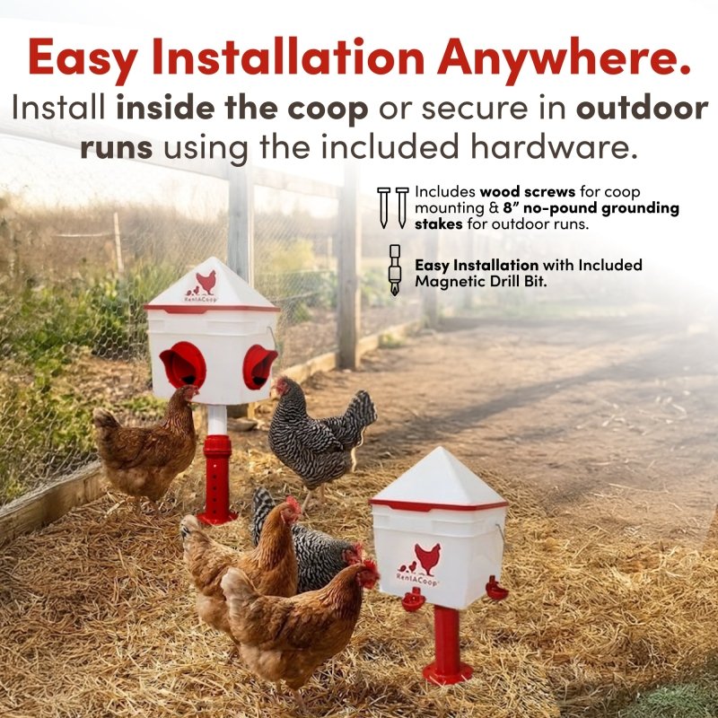 Easy Coop or Run Installation | Both the feeder and waterer include a sturdy adjustable stand designed for indoor or outdoor use. Wood screws secure the stands inside the coop, while grounding stakes provide stability outdoors. A 13mmmagnetic driver bit is included for quick installation with an electric screwdriver, and built-in stand storage keeps extra hardware organized.