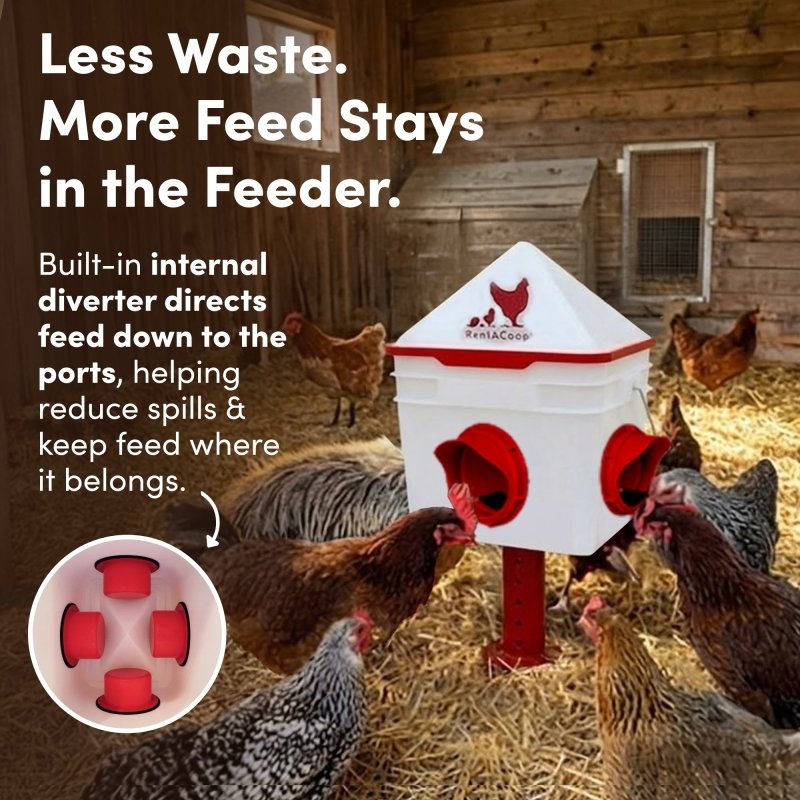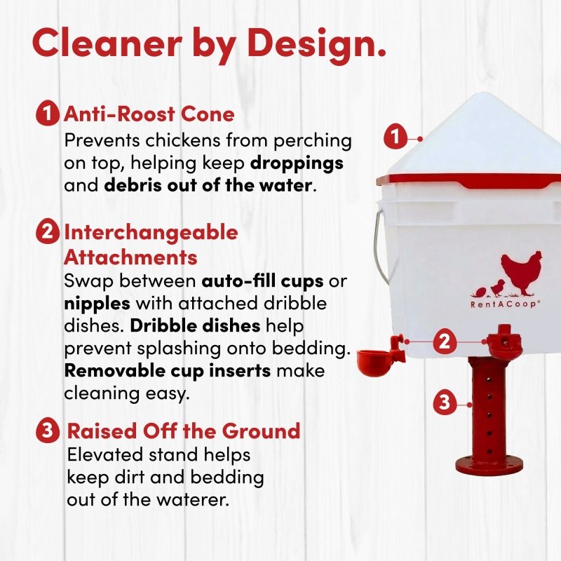 Reduce Wasted Feed & Keep Water Clean | The feeder's elevated stand keeps debris, dirt, and bedding away from feed, while the built-in food diverter directs feed toward the ports for consistent access as levels drop. The waterer's anti-roost cone prevents chickens from perching on top, keeping dirt and debris out of the water. Removable cup inserts make cleaning fast and easy