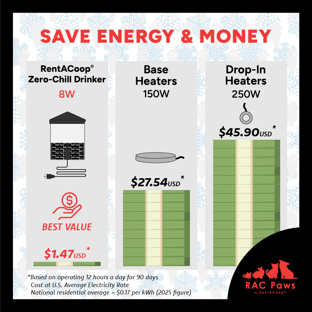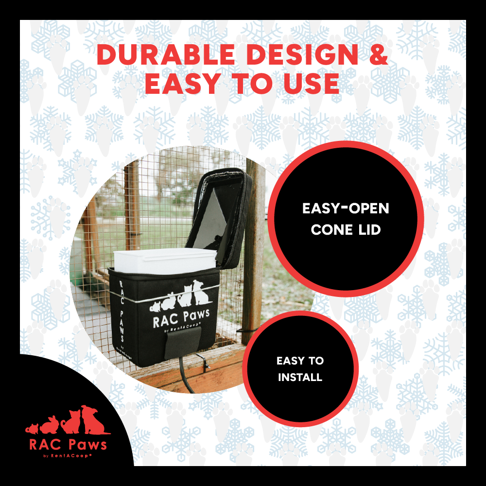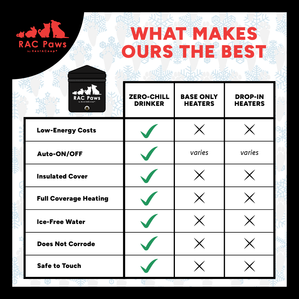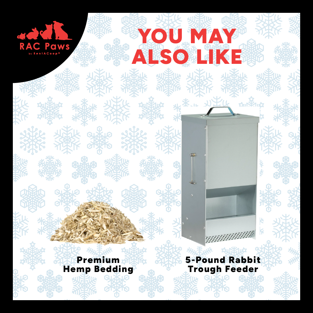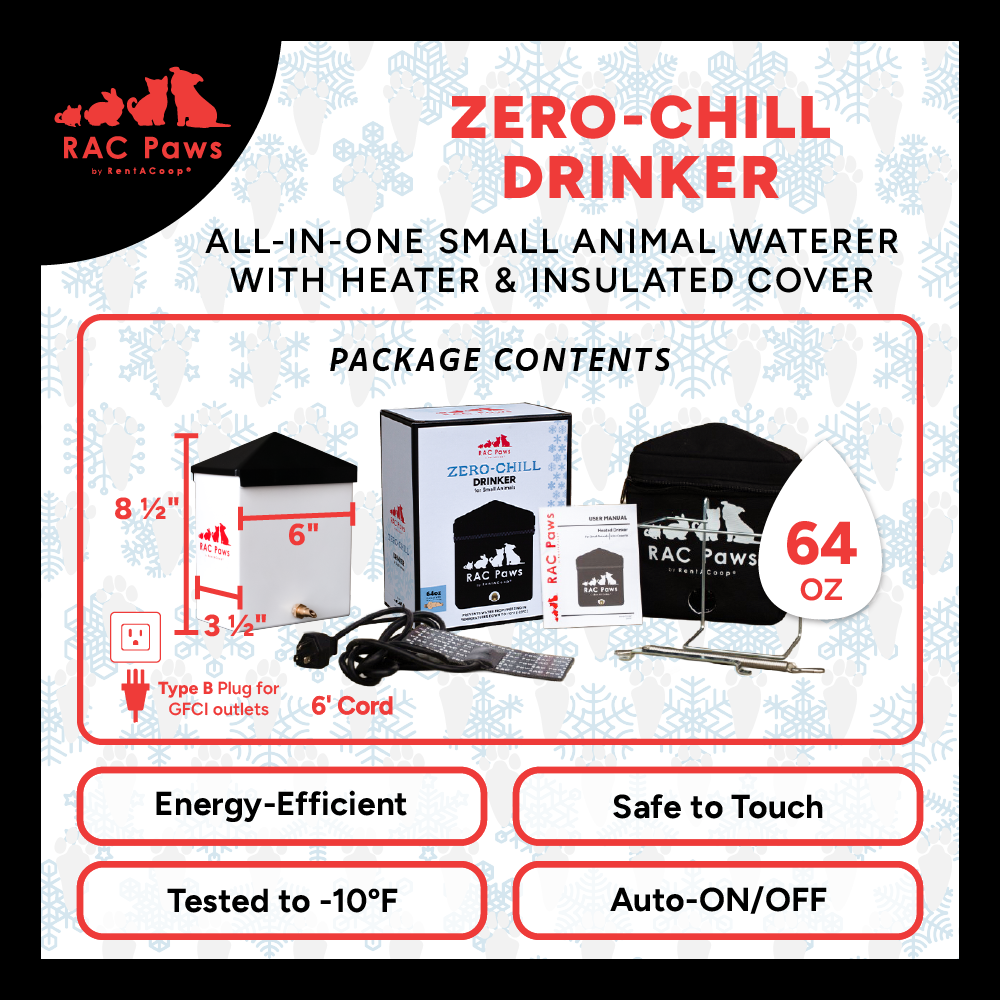 Keep your animal’s water frost-free all winter long with the RAC Paws by RentACoop 64 Oz Zero Chill Drinker. Designed for reliability and ease of use, this heater ensures your rabbits and other small animals always have access to fresh, unfrozen water, even in extreme cold. Tested to withstand temperatures as low as -10°F, the Zero Chill Drinker provides peace of mind during the harshest winter days. With its durable design, smart heating system, and energy-saving performance, the RAC Paws Zero Chill Drinker is the ultimate cold-weather solution to keep your animals hydrated all winter long.