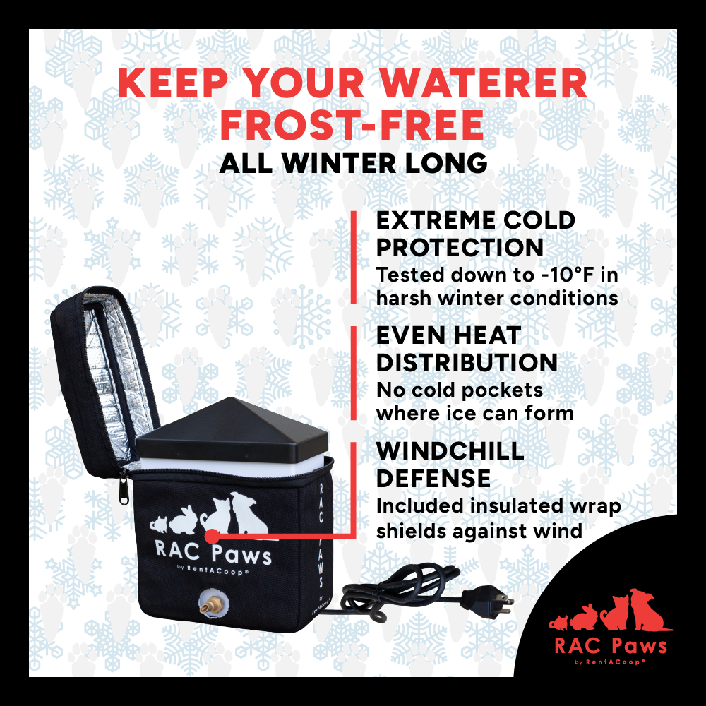 RAC Paws by RentACoop Zero Chill Heated Drinker – 64 oz All-in-One Small Animal Waterer with Heater & Insulated Cover, Cold-Weather Tested to -10°F, for Rabbits and Guinea Pigs