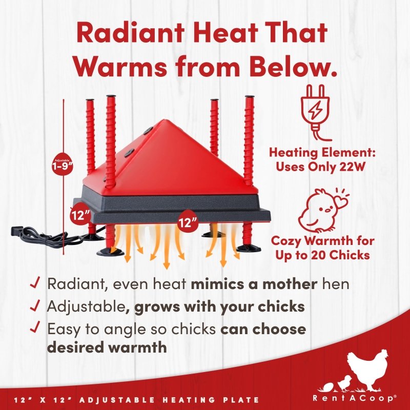 Designed for your flock | Our 12x12" adjustable Heating Plate with Foldable Anti-Roost Cone warms up to 20 chicks. Radiant heat teaches chicks to regulate their body temperature naturally, just as they would under a mother hen! This heat plate can be used for chicks, turkey poults, ducklings, quail, and more