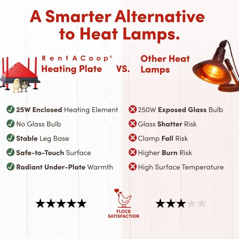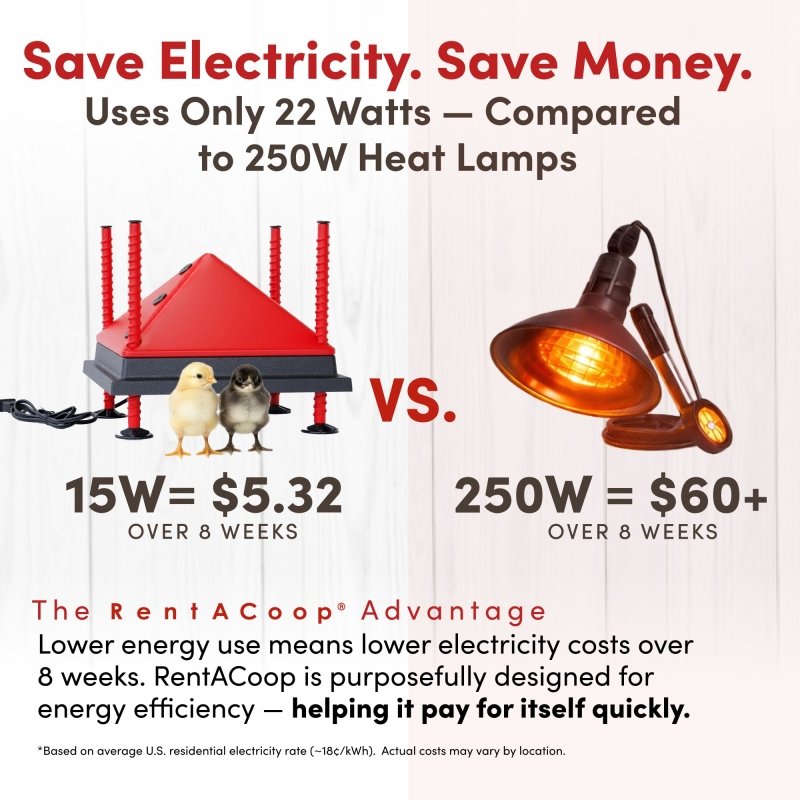 Save Energy and Money | Our energy-efficient 12x12" radiant brooder heating plate for chicks uses only 22 watts per hour, compared to the 250 watts used by a heat lamp. Without the fire risk of heat lamps, our heating plates with adjustable heights are safe and save you money over multiple weeks of 24/7 usage!